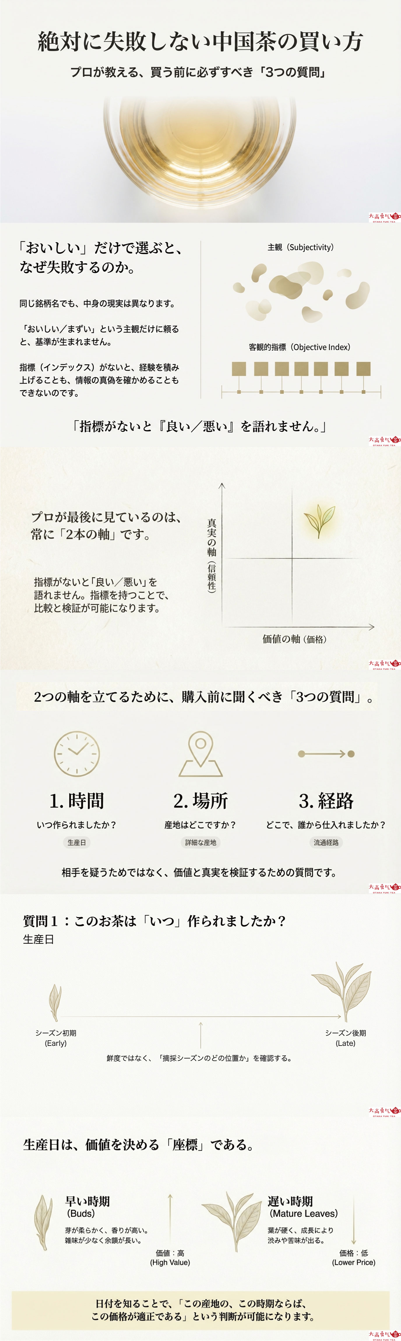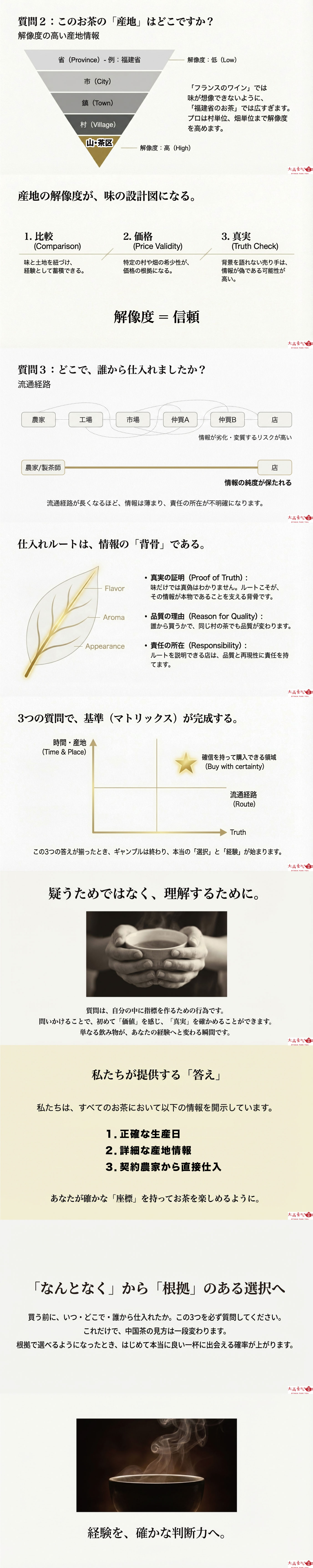 【原産地の中国茶が、迷わず選べる専門店】産地・生産日・テイスティングメモなど、選定の根拠を明記。