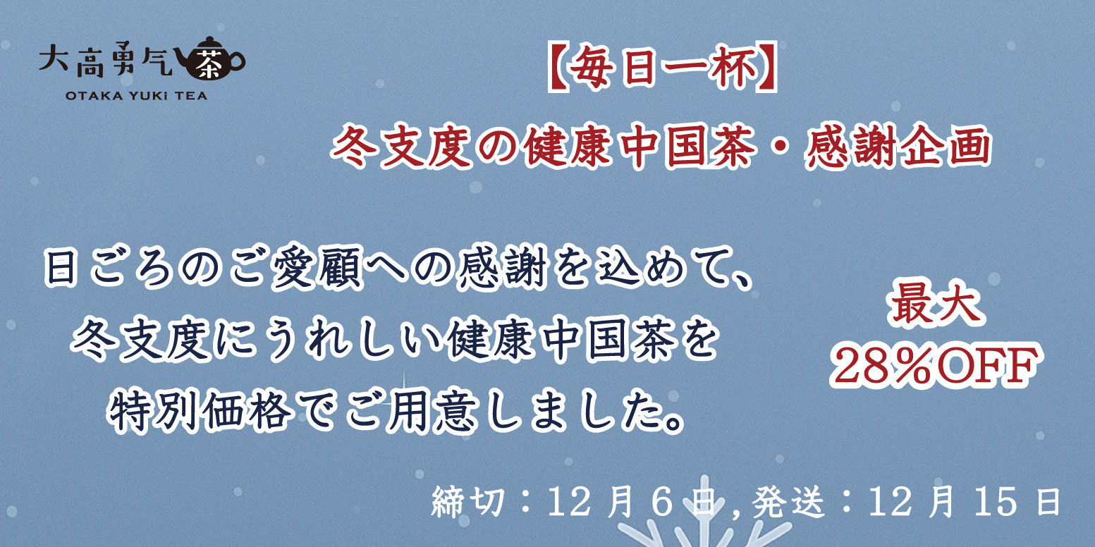 【毎日一杯】冬支度の健康中国茶・感謝企画は、日ごろご愛顧くださっている皆さまへの“ささやかな贈り物”としてご用意しました。冷えやすい季節にうれしい、中国茶ならではのすっきりした飲み口と、からだを内側か…