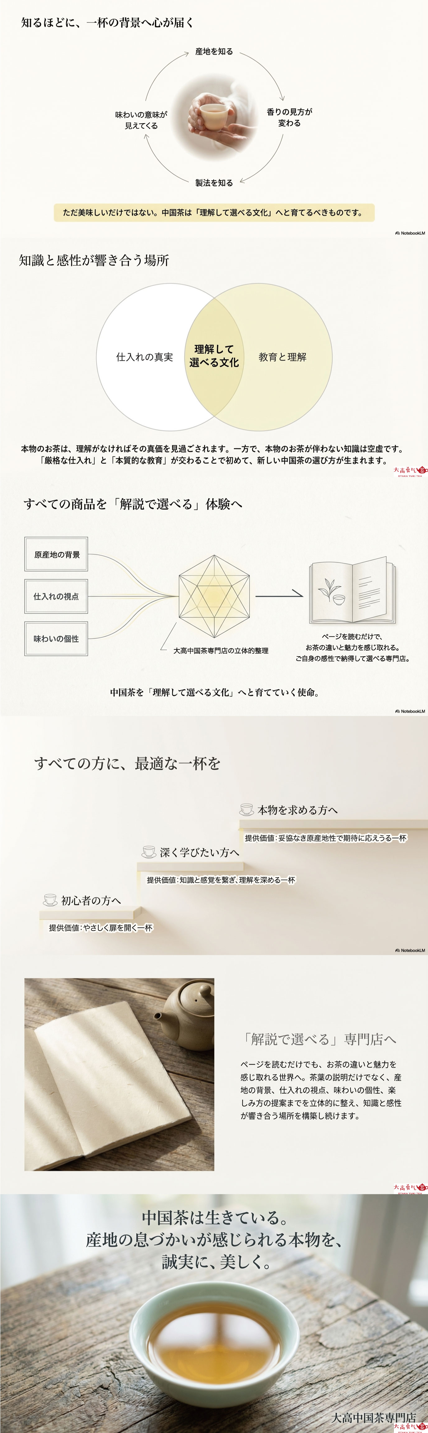 「買う前に分かる」「飲んだあとに理解が深まる」——その体験が積み重なるほど、中国茶はもっと自由に、もっと楽しくなります。